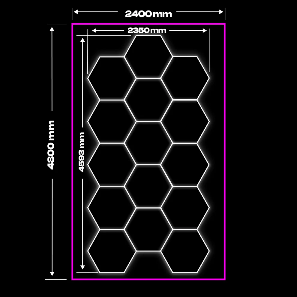 Onze set van 15 Hexagon LED-lampen, omgeven door een prachtige roze omlijsting, biedt krachtige en heldere verlichting die perfect is voor ruimtes waar veel licht nodig is. Deze niet-dimbare lampen hebben een lichttemperatuur van 6500 K, wat zorgt voor verfrissende en heldere verlichting in de omgeving.