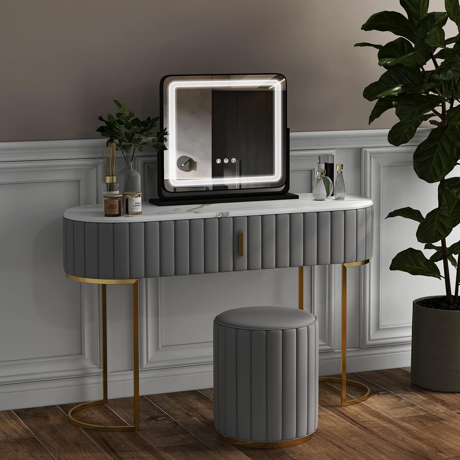 • Traploos dimbaar: Pas de helderheid aan van 10% tot 100% met slechts één aanraking. De draaibare make-upspiegel met dimbare lampen biedt volledige controle over je look en sfeer.