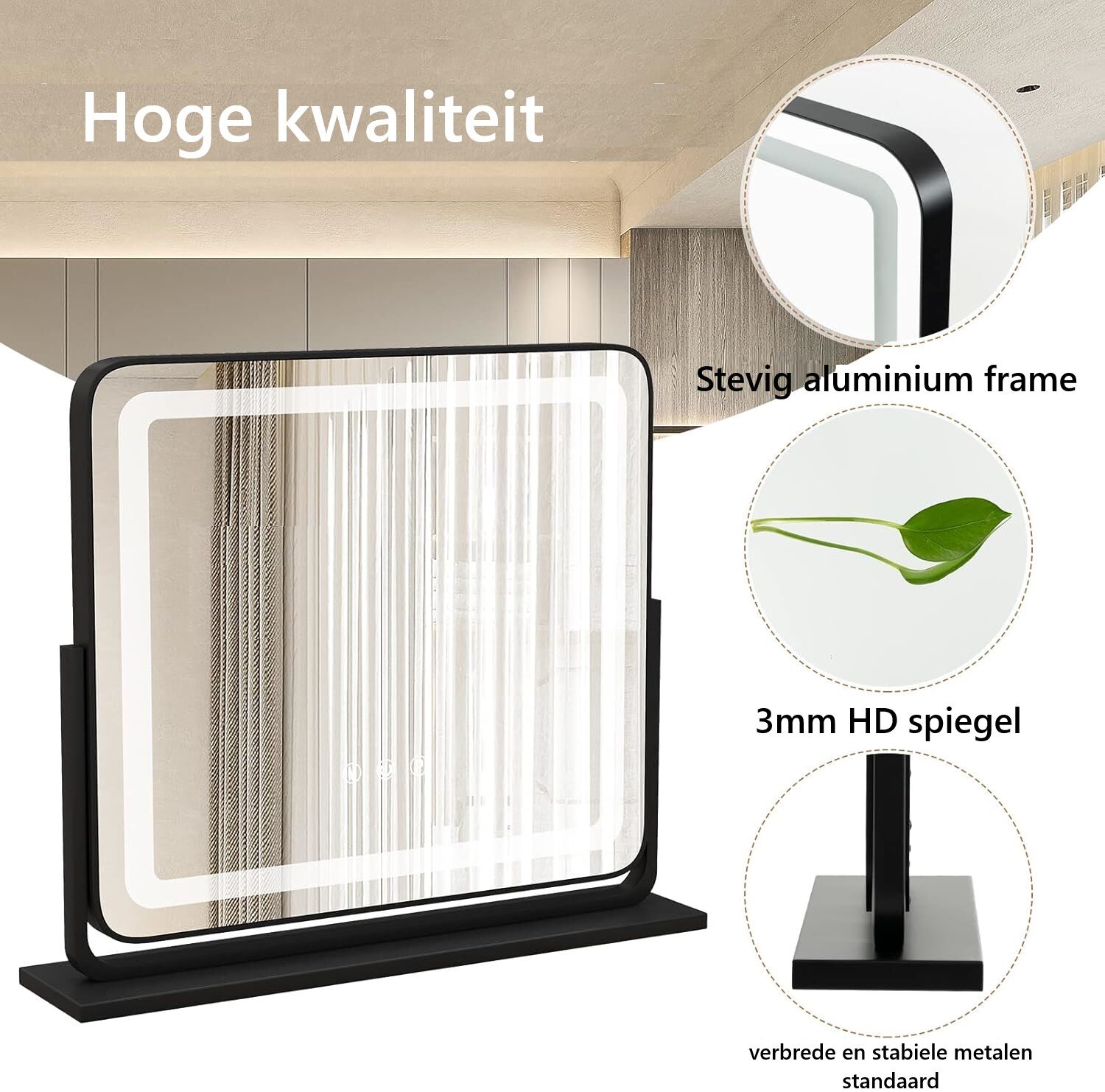 • Stevig aluminium frame en metalen voet: Deze spiegel met aluminium frame en verlichting is duurzaam en stabiel. Perfect voor je kaptafel of badkamer.