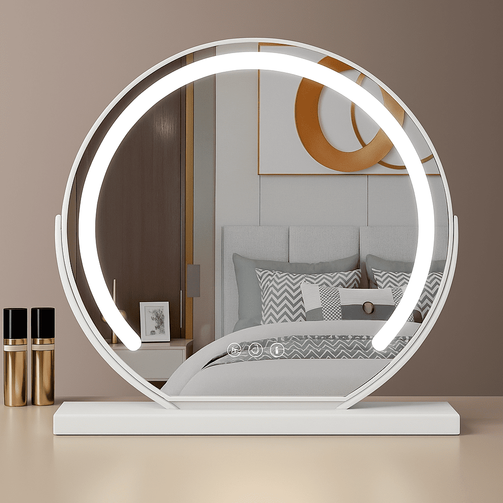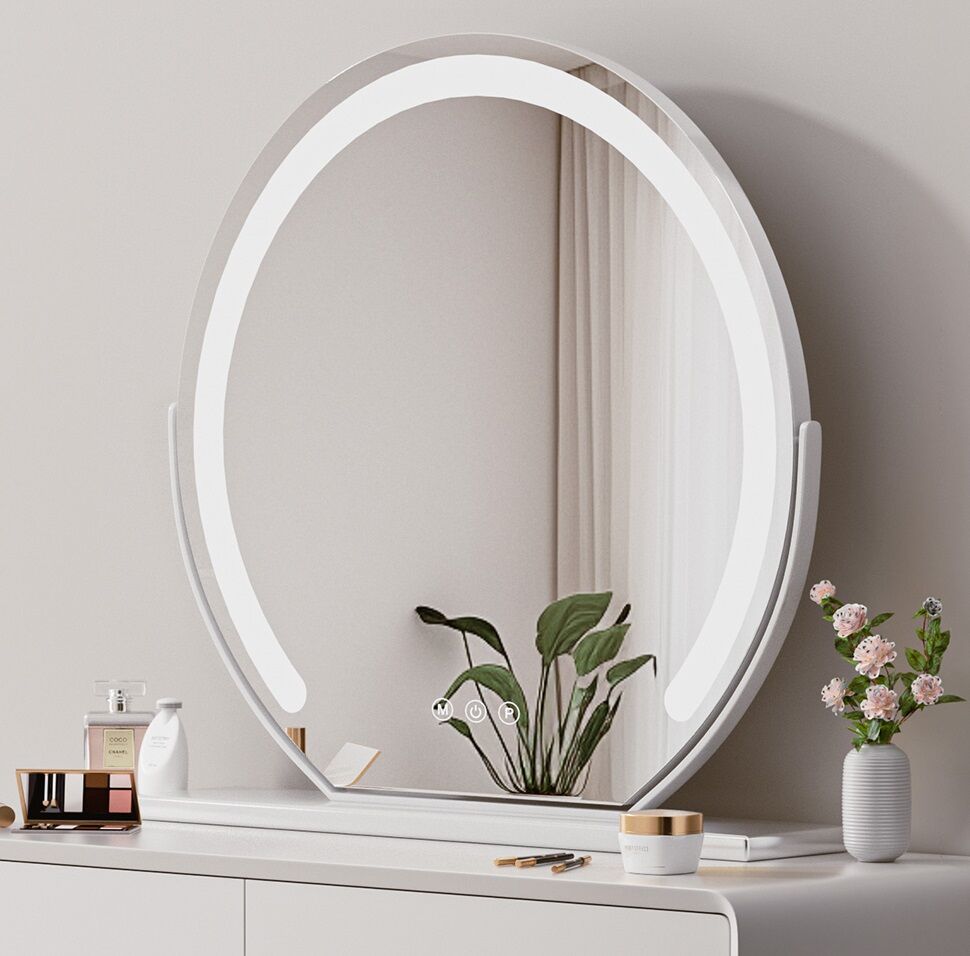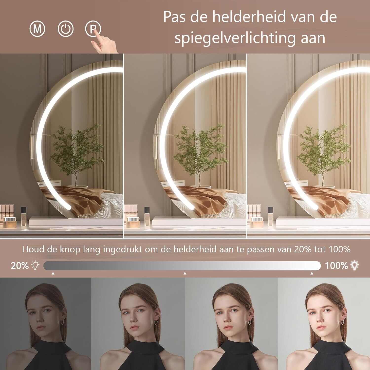 Deze moderne spiegel combineert helder LED-licht met een strak design. Perfect voor je kaptafel, badkamer of slaapkamer.