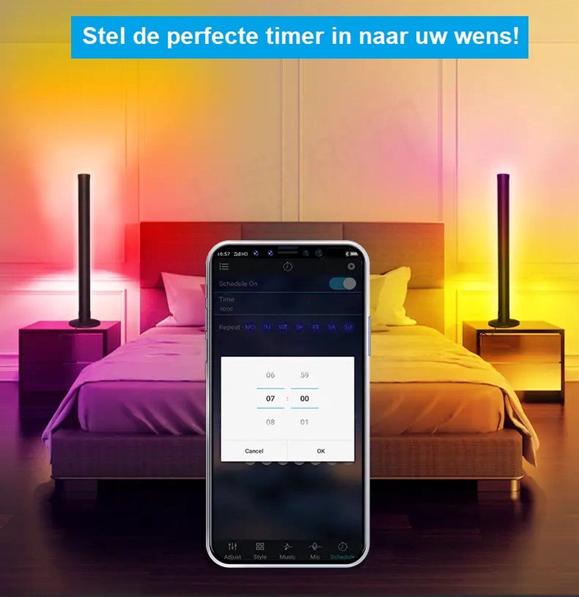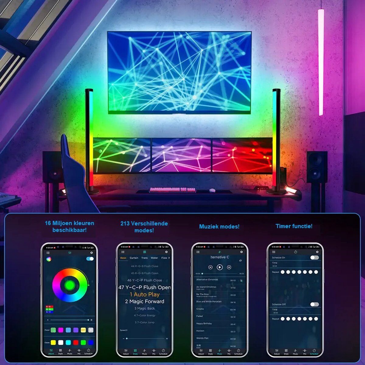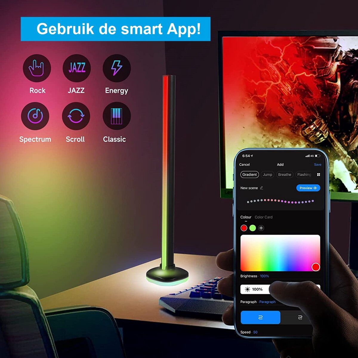 Met de ingebouwde microfoon verandert de ritmesfeer van kleur volgens de muziek of geluidsritme. Speel je favoriete muziek af en de SL LED bar verandert van kleur en snelheid op basis van ritme. De kleur, combinaties en functies zijn allemaal vrij in te stellen met de app.