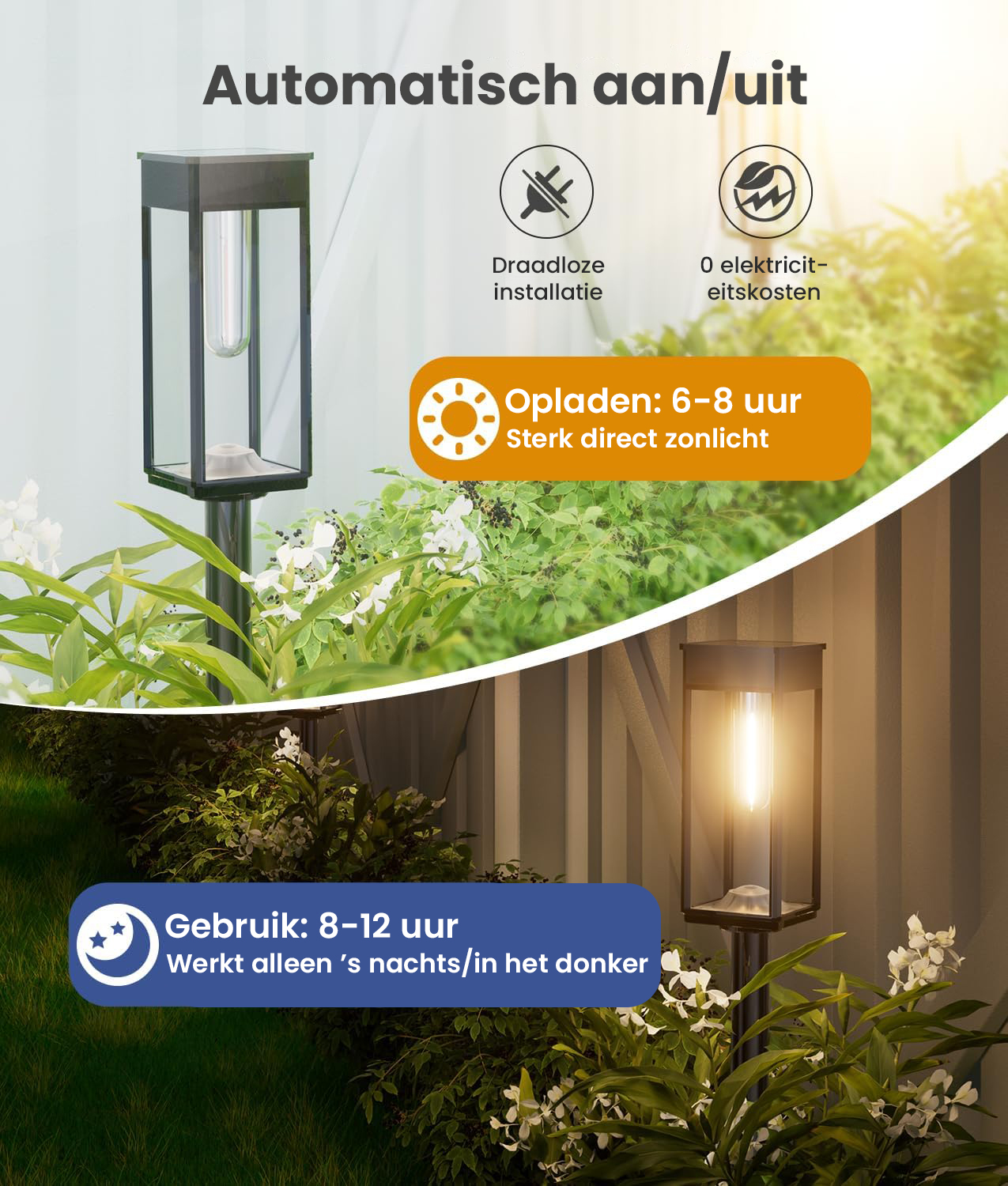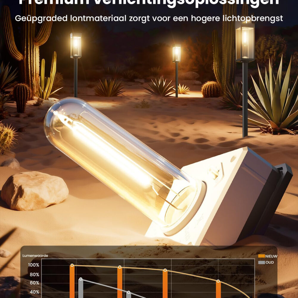 - Automatisch Gemak – De ingebouwde lichtsensor schakelt de lampen automatisch aan bij zonsondergang en uit bij zonsopgang.