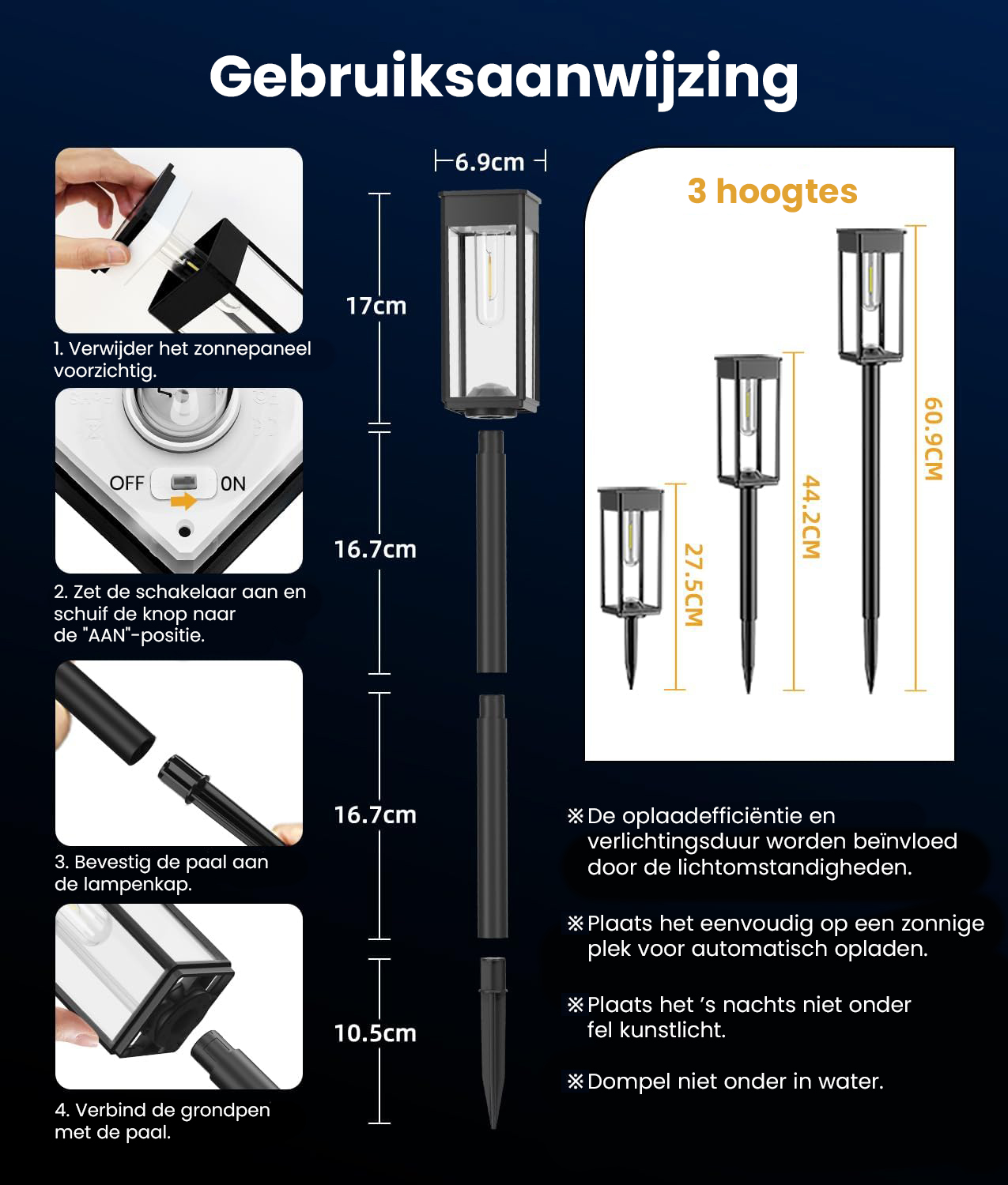 - Eenvoudige Montage – Geen gereedschap nodig; de lampen staan binnen enkele seconden stevig in de grond dankzij het grondpen-systeem.